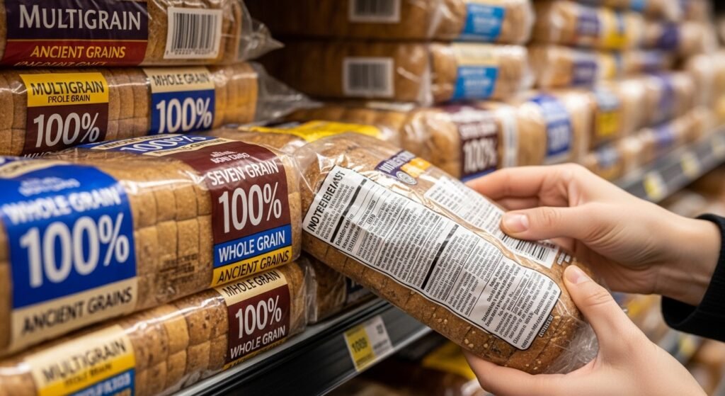 Labels that mention whole grains can be misleading if the product still contains mostly refined flour. Terms like multigrain or made with whole grains do not guarantee high fiber content. Checking if whole grains are listed as the first ingredient is more reliable.