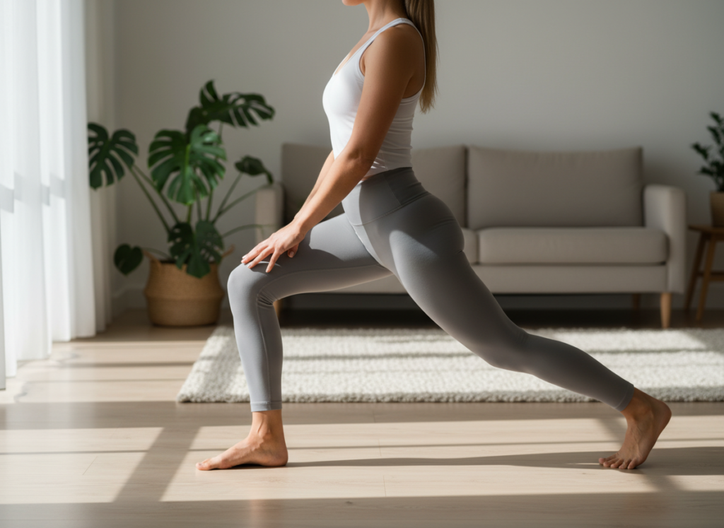 Tight hips may be loosened by taking one foot backward into a light lunge and maintaining the torso in a straight position. In the long run, this may lessen straining the lower back, which occasionally influences alignment.