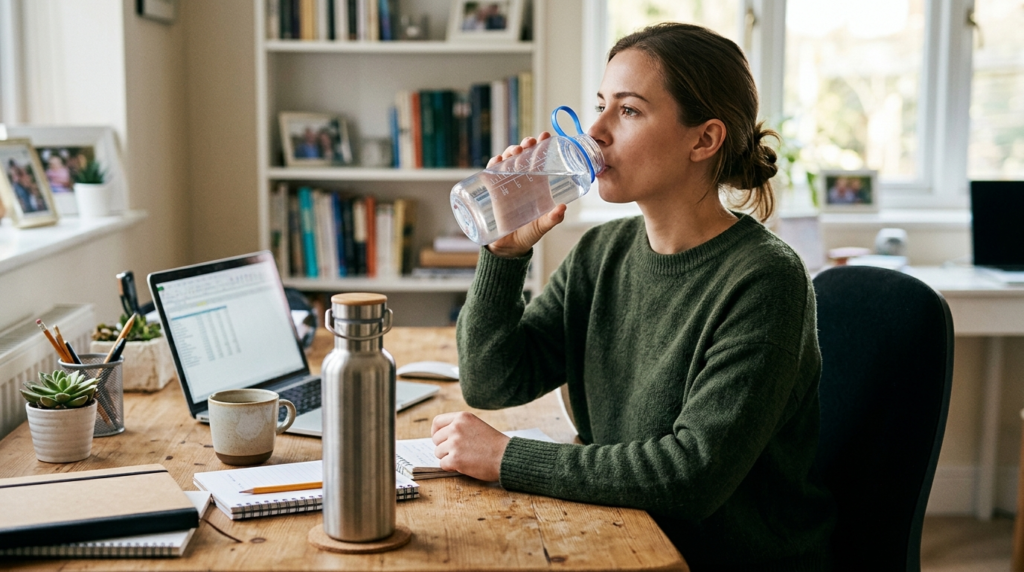 A simple trick that may enhance your energy levels is keeping a water bottle next to you. This is because being hydrated may help avoid the afternoon slowdown that causes one to turn towards more caffeine.