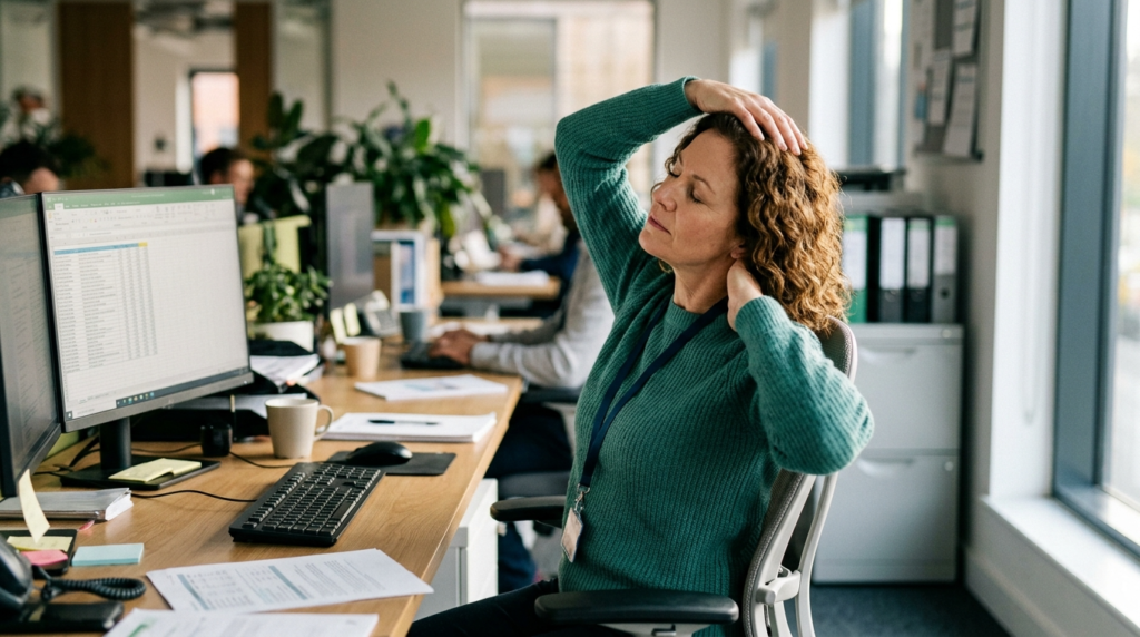 When working long hours, shoulders tend to creep towards the ears. You can break and stretch your neck and back, too, as this could help avoid developing tightness in the long run.