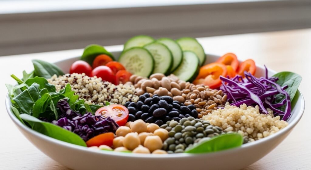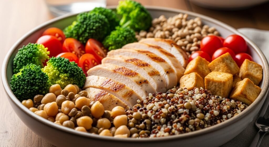 Including a strong protein source such as grilled chicken, tofu, or lentils helps maintain muscle and keeps hunger in check. Protein slows digestion, which prevents sudden energy drops. A meal with at least 20 to 30 grams of protein can significantly improve satiety and reduce cravings later in the day.