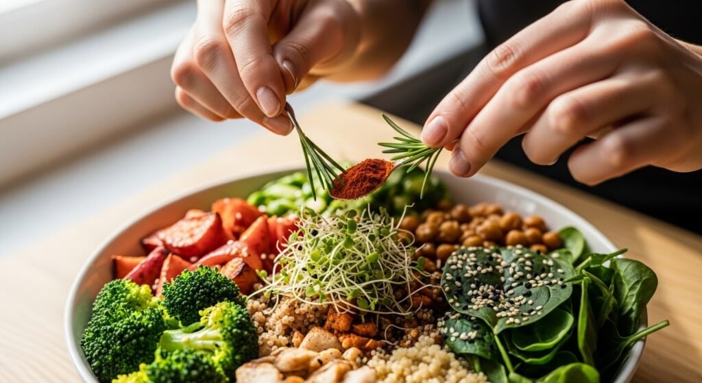 Simple seasonings and sauces prevent boredom without complicating preparation. Using herbs, spices, or yogurt based dressings can change the flavor profile easily. This keeps the meal enjoyable while maintaining the same nutritional foundation.