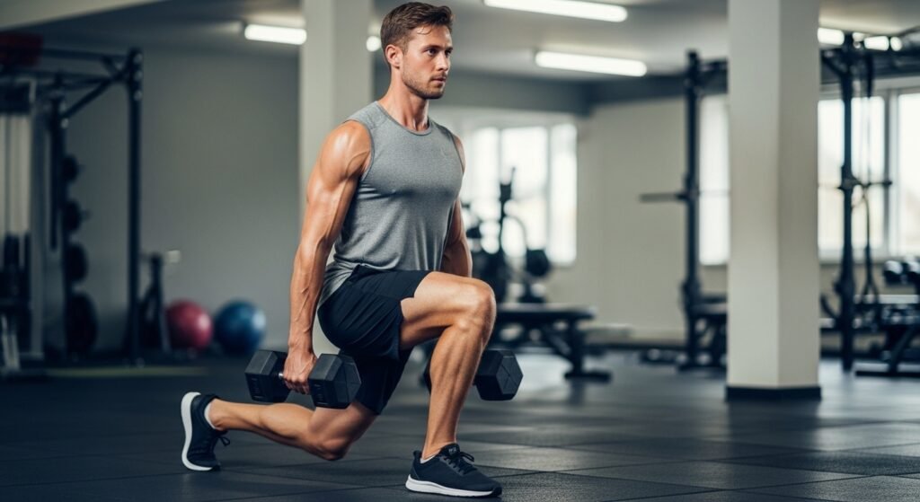 Lunges improve single leg strength, coordination, and balance. They target the glutes, quadriceps, and hamstrings while also engaging stabilizing muscles. Alternating lunges or walking lunges can enhance muscle symmetry and reduce strength imbalances between legs.